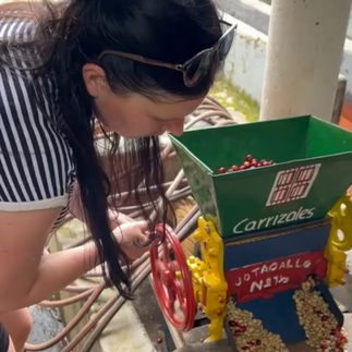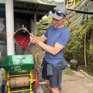 Zurück am Haus freute er sich, dass wir um ein Foto baten, wir tranken alle einen frischen Obstsaft, genossen schweigend die Aussicht und dann gingen wir um die rot weiß gestrichene Finca drum herum. Hier sahen wir die Maschinen und probierten erstmal die ältere, per Hand betriebene aus. Sie trennte die Schale und hinterließ glitschige Bohnen. Wir durften wieder eine im Mund lutschen wie auf der Kakaofarm und auch hier schmeckten wir eine Ananasnote heraus. Er zeigte uns wo und wie lange die Bohnen gewaschen, getrocknet und geröstet wurden und erzählte stolz, dass am 15.Juli eine Lieferung nach Deutschland gehe. Er produziere an die 4.000kg Bohnen pro Jahr und ihm gehörte auch das Café del Alto in Jardín.