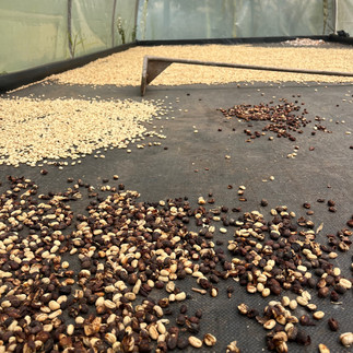 Wir bekamen beide einen Korb in die Hand gedrückt und schon stiefelten wir los. Es gab hier in der Region wohl so an die 700 Familienfarmen, alle klein, d.h. so wie diese „nur“ um die 30.000qm. Gegenüber auf dem Hügel deckten weiße Planen Reihen von Passionsfrüchten ab, die nach Deutschland exportiert wurden. Hier wurden drei Arabica-Sorten Kaffee angebaut: Typica, Bourbon und Catimors. Außer September-November, wo es auch hier heißer wurde, blieben die Temperaturen konstant angenehm. Hier fehlte zwar die Lava-Erde, von dem die Kakaofarm profitiert hatte, aber Sonne und Regen, reichlich im Wechsel, gab es auch hier ausreichend. Er zeigte uns - zurecht mit Stolz - was sie neben Kaffee, Bananen und Avocados noch in ihrem Garten anbauten: riesige Kräuterbüsche, von Tomaten, über Maniok bis hin zu diversen Früchten war alles reichlich vorhanden.