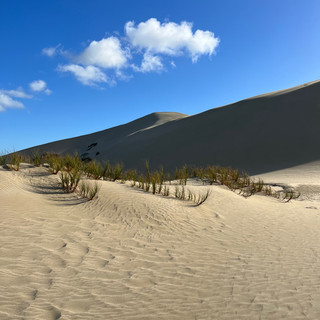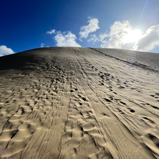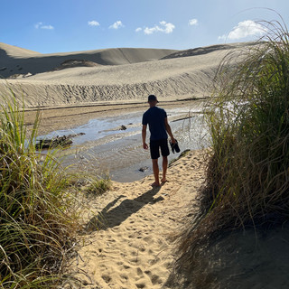 Dann fuhren wir zurück. Auf dem Hinweg hatten wir ein Schild gesehen, welches auf eine Abzweigung zu den Dünen hinwies, die wir beim Fallschirmspringen gesehen hatten. Da waren wir jetzt natürlich neugierig. 3km später blickten wir auf hohe Sanddünen und sahen, dass man Boards für 15NZD leihen konnte. Da wir aber mit unseren gesperrten Kreditkarten nun noch mehr unsere Finanzen im Überblick behalten mussten, entschied ich als Finanzministerin, dass wir leider auf diesen Spaß verzichten mussten. Als wir auf die Dünen zusteuerten und andere jauchzend die Dünen hinab rodeln sahen & hörten, waren wir natürlich total geknickt, aber riefen uns in Erinnerung, dass Dünen an sich einfach schon der absolute Knaller sind. Wir machten uns also daran, die erste steile Düne nach oben zu stampfen und ich sag euch: das war verdammt anstrengend! Da rief es ein paar Meter unter uns, ob wir nicht mal die Boards testen wollten, denn sie bräuchten eine Verschnaufpause und es wäre eine Verschwendung den Berg hochzulaufen ohne den Spaß zu probieren. Gott, wir freuten uns wie kleine Kinder und liefen ihnen freudestrahlend bejahend entgegen. Nun galt es auch noch die Boards hochzutragen, dafür konnten wir aber den Rucksack und mein Handy fürs Filmen unten lassen.