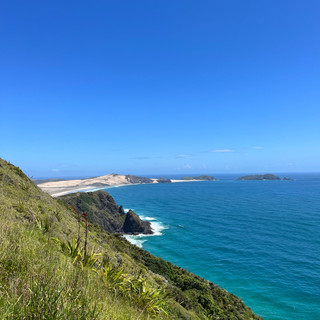 Dann ging es weiter. Das Hauptziel war Cape Reinga im Norden. Es ist nicht ganz der nördlichste Punkt Neuseelands, aber fast. Wir hielten zwischendurch an Haltebuchten mit herrlicher Aussicht und bekamen schonmal einen Vorgeschmack auf dieses schöne Fleckchen Erde und dann waren wir am Parkplatz. Karten zeigten ein paar Wanderrouten und Schilder klärten über die Geschichte und Bedeutung des Ortes auf. Für die Maori, die mich mit ihrer Sprache und den Tattoos völlig faszinierte, war hier, wo tasmanischer Ozean und Pazifik aufeinandertrafen, ein heiliger Ort an dem sich die Seelen „verabschieden“ und wir fanden es einfach herrlich zu sehen, wie sich die beiden Gewässer trafen. Man sah bei genauem Hinsehen eine Linie im Wasser, denn der tasmansiche Ozean ist wärmer als der Pazifik.