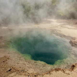 Der große See, der Lake Taupo selbst, bot im Regen nicht ganz so viel Anreiz, also wollten wir die Gegend noch auskundschaften und fuhren zum Orakei Korako. Dieser thermische Park bot Geseire und sprudelnde, schwefelhaltige Erdlöcher wie im Yellowstone, die uns so beeindruckt hatten. Im Internet wurde das preisgünstige Ticket von einem Nutzer gelobt, doch als wir ankamen, waren wir geschockt von $45 p.P. (derzeit sind es in Euro ungefähr 60%). So viel hatten wir für eine JAHRESkarte für ALLE Nationalparks in den USA bezahlt, Herrgott! Also, dass man Eintritt bezahlt für das Shuttleboot und die Instandhaltung der Wege und die Sanitäranlagen…das ist alles kein Problem. Aber der Preis war definitiv ein Problem und wir drehten postwendend wieder um. Zudem schien noch nicht einmal die Sonne, es wehte sogar so ein kühler Wind, dass wir eine Mütze aufzogen.