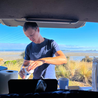 Die Energie sank zwischendurch, v.a. weil man sah, wie weit der Startpunkt noch entfernt war. Mit Pausen waren wir 7,5h unterwegs gewesen und das letzte Stück die Schotterstraße zum Auto hinauf, war wie Folter. Doch ein Wanderer kennt keinen Schmerz und so schlüpften wir schnell in die Badesachen, fuhren zum Steinstrand und bissen die Zähne zusammen. Denn von gestern wussten wir wie gut die Erfrischung tat. Zu Hause in Deutschland gehen wir nach dem Baden im See duschen, um das Seewasser abzuwaschen. Hier ist der See unsere „Dusche“ um den Schweiß abzuwaschen :D Völlig fertig (daran waren auch die aggressiven Sandfliegen schuld) tranken wir eine kalte Cola und fuhren 45min zu einem kostenlosen Stellplatz. Wir hatten eigentlich einen noch 20min weiter eingegeben, aber auf der Fahrt dann die Wiese neben einem Fluss entdeckt, auf der einige Einheimische campten, die uns versicherten, das wäre erlaubt und wir könnten uns dazustellen. Sehr schön, reicht auch für heute, deshalb gab es nur ein schnelles Süppchen am Abend.