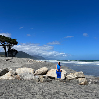 Der Tag konnte beginnen. Es wurde kein Inselhopping, sondern Buchten-Hopping. Wo immer es uns gefiel, stoppten wir an der Küstenstraße und liefen in einer Bucht entlang oder genossen einfach die Aussicht auf das leuchtende Meer unter uns. Wir fuhren in Westport zum Cape Foulwind und wanderten dort zum Leuchtturm und an der felsigen Küste zurück. Dabei setzten wir uns in die Sonne um die Wellen, die gegen die Felsen rauschten, spritzend zu beobachten. Bei jeder größeren freuten wir uns und jubelten, wenn wir rechtzeitig auf den Auslöser gedrückt hatten. Danach fuhren wir ein kleines Stück weiter (heute fuhr ich wieder mal, hoch konzentriert im Linksverkehr) zur nördlichsten Seelöwenkolonie Neuseelands, so stand es geschrieben. Ähm. Nun ja. Wir entdeckten ein erwachsenes Paar weit unter uns und einige kleine; man erkannte es am Gewusel. Der Rest schien ausgezogen, das war jetzt also nicht das größte Spektakel und blaue Pinguine entdeckten wir gar keine. Aber am Strand glitzerte es nicht nur golden sondern eine kleine blaue giftige Qualle lag bereit mir zu gratulieren.