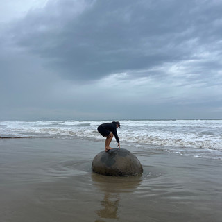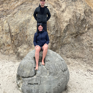 Eigentlich wollten wir heute nochmal Saskias Rat folgen und zum Silver Peak laufen, aber irgendwie merkten wir auf der kurzen Fahrtstrecke dahin, dass wir beide heute gar keine richtige Lust dazu hatten. Deshalb fuhren wir weiter, stoppten in einem seltsamen Dorf um Eric eine Honigwabe zu kaufen und peilten ein Ziel an, auf das wir uns schon sehr freuten: die Moaraki Boulders neben dem Dörfchen Moaraki. Dabei handelte es sich einfach um runde Steine, die den Strand schmückten und - wie wir bald feststellten - auch eine herrliche Fotokulisse ergaben. Es machte richtig Spaß auf ihnen herumzuhopsen und zu versuchen den Wellen zu entkommen und verschiedene Fotos zu machen. Eine Dame beobachtete uns und bot fröhlich an Fotos von uns beiden zu machen und die waren richtig schön. Liebe ist in der Luft :) Thihi.