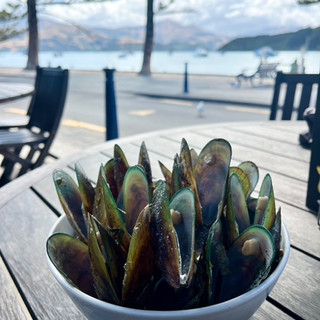 Dann liefen wir in der Bucht rüber zum zweiten Teil des Örtchens und dort gab es, mit leichter Verspätung, mein Geburtstagsessen (danke an die heimatlichen Sponsoren): 1kg Grünlippmuscheln (ein regionales Gericht) in Knoblauch-Weißwein-Soße und für Eric gab es einen Fisch-Burger (war wohl auch richtig lecker). Mit zwei Getränken zahlten wir nur 43€, da hatten wir mit mehr gerechnet. Reicht natürlich! Klar, aber für hiesige Verhältnisse…