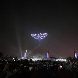 So und nun fragt ihr euch schon Zeilen lang: Na wo sind sie denn nun? Ihr habt ja Recht, ich erkläre es. 20:50 Uhr, also bei ausreichend dunklem Nachthimmel begann eine von wirklich guter Musik begleitete Drohnenshow. 500 beleuchtete Drohnen formatierten sich in verschiedenen Farben zu Figuren und es war gigantisch! Daher der Name „elektrische Himmel“.