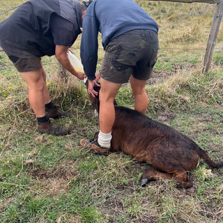 Als wir ankamen begrüßte uns James (24) schon fröhlich in der offenen Tür und rief uns zu, wir kamen genau richtig. Sein Bruder Mark (25) und sein Vater versuchten gerade eine giftige Schlange einzufangen. Na das war ja genau das richtige für mich. Ich suchte die Flucht ins Innere des Hauses und erfuhr dort, dass die Schlange ihnen entwischt sei. Das wurde ja immer besser :D Wir wurden, wie schon häufiger, zu unserer großen Freude aufgenommen und begrüßt wie alte Freunde, bekamen erstmal ein Getränk und nach kurzem Vorstellen beim Vater und erzählen, was die letzten Tage so los war, ging es auch schon los. Wir hüpften alle fünf in den Truck und dann fuhren wir auf die Weiden und bekamen alles gezeigt und erklärt. Natürlich sind wir keine Großstadtkids, die noch nie eine Kuh gesehen haben, aber das war schon etwas Besonderes und sehr informativ. Eric kam aus dem Schwärmen gar nicht mehr raus, wie interessant das alles war. Und er hatte Recht. Zuerst sahen wir ein an einer Krankheit verendetes Kalb. Von ihm hatten sie ein bisschen Fell um ein Zwillingskalb gebunden, welches von seiner Mutter kaum beachtet wurde und nun von der Mamakuh des verstorbenen Kalbs durch den Geruch als eigenes angesehen werden würde. So könnte es die Milch trinken und überleben. Das Annähern läuft langsam an. Dann fuhren wir auf die Weide mit den trächtigen Kühen. Mit 12 Hektar, so erklärten sie, seien sie eine kleine Farm und nehmen sich gern mehr Zeit für ihre Tiere als das andere Grossfarmer machen würden. Eine Kuh hatte sich schon von der Gruppe abgesondert und das ist wohl ein Merkmal dafür, dass die Geburt bald bevorstand. Nach dem Check, dass alles okay war, ging es zu den Sorgenkindern. Auf Grund eines in der Wiese lebenden Käfers waren viele Kälbchen erkrankt, hatten Fieber und Durchfall. Diese Woche könnte das Glück auf ihrer Seite stehen, da die Temperaturen runtergekühlt waren. Es war wohl eine besondere Situation, da es selten so viele (gleichzeitig) betrifft und sonst viel weniger los sei. Extra für uns sozusagen ;) Es galt nun die Kälber der Mütter, beide trugen die selbe Nummer, im Gras zu finden und je nach Zustand gab es ein Medikament und Elektrolyte. Jedes Mal half man den Kälbern auf die Beine, in der Hoffnung sie laufen selbstständig ans Euter trinken. Einige waren echt schlappi, andere schon auf dem aufsteigenden Ast.