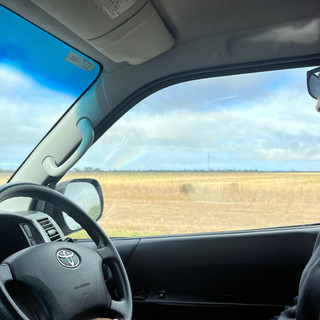 Unterwegs sahen wir drei Kängurus friedlich im Gras neben uns - das ist schon ein schönerer Anblick als zermatscht am Straßenrand. Kurz darauf, auf der anderen Straßenseite, spannte sich ein Regenbogen von links nach rechts. Ich liebe Regenbögen. Weinfelder erstreckten sich bis zum Horizont. Wirklich überall wuchsen Weinreben um uns herum.