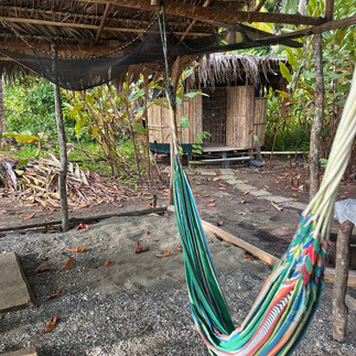 Wir liefen zum Pier, standen unbeholfen herum, doch wurden Gott sei Dank bald angesprochen, ob wir die Gäste von Estefania & Giovanni seien. Jupp, auf ging’s im (vielleicht spritsparenden) Schneckentempo den Fluss entlang. Zunächst wechselten sich Baracken und neuere Häuser ab, dann kamen Mangroven und dann waren wir auch schon da, wurden empfangen, liefen an einem Friedhof vorbei, 500m am Strand entlang (samt Gepäck) und wurden zu unserem Zelt gebracht - direkt am Strand mit Hängematten. Das kleine Badehäuschen war herzallerliebst, aber wir stutzten. Irgendwie hatten wir gedacht hier würden mehrere Zelte stehen, aber die Fläche daneben war leer. Wir fragten nach einem Kühlschrank und da sie eine weiter hinten gelegene Hütte nicht vermieteten, konnten wir den darin befindlichen nutzen. Eine Küche gab es nicht und heute auch kein Abendessen, obwohl es geheißen hatte, zwei Stunden vorher Bescheid geben reiche. Morgen war Schließtag, da sollen wir was im Ort essen. Aber immerhin gab es einen Willkommenskokosnuss und wir durften uns Sternfrüchte vom Baum pflücken, dazu aßen wir Cracker. Für eine Ecolodge am Strand, die man nur per kurzer Bootsstrecke erreichte, war es schon seltsam, dass es keinen Trinkwassertrank gab. Wir packten erstmal alles für die nächsten drei Nächte aus, die ja eigentlich vier hätten sein sollen.