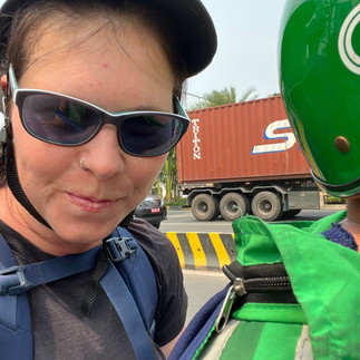 Als uns zwei Grab-Fahrer, eine Art Motorrad-Taxi, ihre Dienste anboten, überlegten wir kurz und zeigten ihnen welche Busstation sie ansteuern sollten. Eric hatte das Glück, dass sowohl sein Helm besser saß als auch, dass sein Fahrer seinen großen Rucksack vor sich nahm. Bei mir hing der 17kg Rucksack auf halb acht an meinem Rücken, der Helm wurde immer vom Fahrtwind vom Kopf geschoben. Zwischendurch dachte ich mein Steiß verkrampft. Ich war froh als wir kurz zum Tanken anhielten damit ich mich neu ausrichten konnte und gab es auf mich festzuhalten. Stattdessen hielt ich den Riemen des Helms und den des Rucksacks unterm Kinn. Ich dachte Eric kippt mir vor Schreck angesichts der Erfahrung aus den Latschen. Ich war ja zumindest schonmal in Indonesien gewesen und fühlte mich, da ich selbst Motorrad fahre, eigentlich ganz wohl und warum auch immer, vertraute ich unseren Fahrern. Eric hatte Angst, dass sie uns trennen und in verschiedene Richtungen fuhren. Aber die Vietnamesen gelten als sehr friedliches Völkchen, außerdem wussten sie, dass Eric für beide zahlen würde ;)