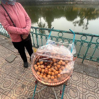 Wir liefen noch zu einer Pagode hier am See. Da man aber laut einem Schild mit Shorts nicht direkt hineingehen sollte, respektierten wir das und beschränkten unseren Besuch auf einen kleinen Fotostop. Davor probierten wir an einem Stand süße runde Sesambällchen.