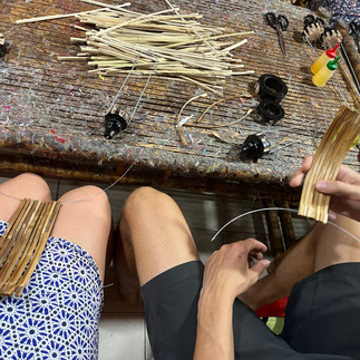 Es saß keiner am Empfang also nahmen wir uns einfach zwei Räder. Auf der Endrechnung stand dann auch nur ein Tag. Wir fuhren mal beim Straßenstand vorbei, wo wir unsere Rucksäcke abgegeben hatten. Der Stand war noch da, beruhigend ;) Dann suchten wir die Gasse mit dem kleinen Atelier, zogen die Schuhe aus und setzten uns an die lange Tischreihe. Ich fragte nach ob es vielleicht möglich war eine kleinere Lampe (wie die, die wir gestern gemacht hatten) anzufertigen, damit sie besser in den Rucksack passten und sie schnitten uns neue Bambusstäbe zurecht. Mit uns saß eine Dänin zusammen und dann fädelten wir alles auf den Draht, bogen es in die gewünschte Form um einen dickeren Bambus, schwangen den Faden rum und bei jedem Schritt half einer der fünf Brüder oder die Schwester (wenn nötig), damit es so perfekt wie möglich wurde. Die Form, die ich hatte machen wollen, sollte ich nicht machen. Die wäre wohl zu schwer. Aber okay. Kritischer wurde es als es einfach keinen hübschen Stoff geben wollte. Also anders gesagt: es gab nichts hübsches blaues und ja ich zog eine Schnute. Man durchwühlte den Dachboden für mich und zeigte mir zwei blasse Blautöne. Nein, die waren nicht wirklich schön. Dann fand man noch einen leuchtend blauen, aus dem gleichen Material wie die anderen. Okay, nun lachte ich wieder. Eric wählte, mit meiner Zustimmung ;), einen weißen mit dunkelblauem Muster und dann ging’s weiter, wie wir es von gestern kannten. Gestern waren die Stoffe bei Weitem hübscher, heute machte der ganze Prozess mehr Spaß, es war fast meditativ. So ganz zufrieden war ich mit meiner nicht, aber Erinnerungsfotos wurden nach gut drei Stunden natürlich trotzdem geschossen :)