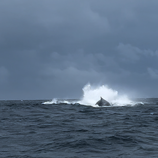 Zu Beginn waren wir skeptisch, denn er tuckelte nur so vor sich hin und ich hatte das Ziel in den Norden zu fahren. Wir schauten immer wieder auf die Uhr. Irgendwann drehte er sogar mal um und ich dachte schon hier liege ein Missverständnis vor, aber er dachte etwas gesehen zu haben. Wir fuhren weiter und bald sahen wir in der Ferne die ersten platschenden Wale. Ja, ja, ja! Zwei Stunden waren wir circa gefahren und waren jetzt in Höhe des Utría Nationalparks. Dann tauchten Rücken auf, die Löcher pusteten und bald schon waren wir gleichermaßen erleichtert wie begeistert. Wir wussten bald gar nicht mehr in welche Richtung wir schauen sollte, er folgte mal dem einen, mal dem anderen. Wir hörten und sahen drei Wale jagen, die See war mittlerweile rauer geworden - es schaukelte uns richtig durch. Die Walgeräusche zu hören war traumhaft, immer wieder schlug eine Flosse auf, sie tauchten auf, sie tauchten ab.