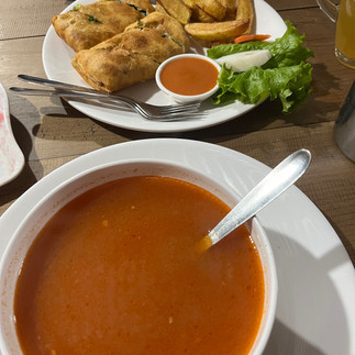 Ich stellte mir, als wir auf unsere Tomatensuppe und die gefüllte riesige Springroll bei einer Tasse Tee warteten, die Fragen: