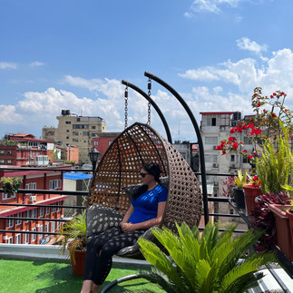 Dann bogen wir ins Gewusel ein. Halleluja, hier war was los! Ein Geschäft reihte sich ans andere, aber wir flohen erstmal in die Ruhe des 14summits-Büro. Dies war eine nepalesisch-tschechische Reiseagentur über die Urken arbeitete, da man immer ein Unternehmen brauchte. Wir sollten die Reisepässe dalassen, das hassen wir ja, aber uns wurde versichert, dass sie hier sicher seien, ich machte Fotos, wir googelten schonmal die deutsche Botschaft und was anderes blieb uns eh nicht übrig, da sie ihn brauchten um alle permits zu beantragen. Wir gingen auf die Dachterrasse und bestellten ein günstiges Gericht (gebratenen Reis) und brutzelten in der Sonne. Es war jetzt affenheiß. Ich hätte nie gedacht, dass wir hier so ins Schwitzen kamen und ich hatte ja im Moment keine Sonnenbrille. Ich zog mich in den Schatten in einen Schaukelstuhl zurück und ließ die Männer über Berge & Routen fachsimpeln. Das Essen dauerte eine Weile und wir schmolzen dahin. Warum genau wir fast eine Stunde warteten um nochmal ins Büro zwei Etagen tiefer zu gehe, verstanden wir nicht, aber das spielte wohl auch keine Rolle :D Gegen 15 Uhr zogen wir dann mit Urkens „Schutz“ durch die Läden. Er wimmelte alle ab und handelte die Preise runter. Wir sollten noch merken, dass es ohne ihn nicht so einfach werden sollte. Wir kauften mir für 5.60€ blaue Trekking-Stöcke. Leihen wäre teurer gewesen. Ein rotes Paar hatte Urken, das bekam Eric. Wir schauten nach dicken Jacken, aber wollten da morgen nochmal allein losziehen, da es schon komisch war, wir Urken mit einem abwesenden Lächeln und verschränkten Armen nicht von unserer Seite wich :D Er hatte uns hier in irgendeine versteckte, preiswerte Hinterkammer, zwei Stockwerke nach oben, geführt. So ein „Geschäft“ hatten wir noch nie gesehen, aber es tat seinen Zweck. Wir sind uns sicher, dass hier fast 100% Fälschungen sind, aber dafür kam alles auch nur einen lächerlichen Bruchteil als in Europa. Manche waren gut gemacht, andere stimmten schon beim Namen nicht ;D