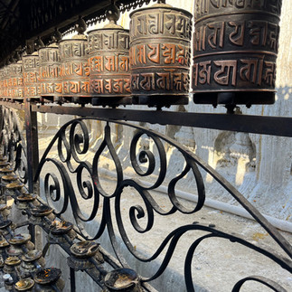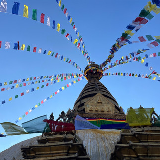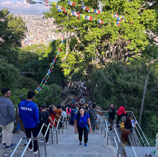 Wir liefen eine sehr, sehr, sehr lange Treppe nach oben und konnten nicht nur auf die Stadt unter uns und das Bergpanorama dahinter blicken, sondern auch die für Nepal so typischen Gebetsfähnchen vor den Kuppel bestaunen.