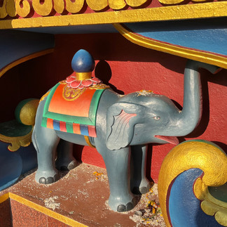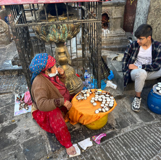Wir fuhren zum buddhistischen Tempel Swayambhu Stupa. Das war der, der uns abends vom Dach aus angeleuchtet hatte. Überall waren Menschen, viele davon in festlichen Kleidern herausgeputzt, sie zündeten Kerzen an, ließen sich segnen und natürlich gab es auch genug Selfies an jeder Ecke vor den prächtigen Buddha-Statuen oder vor den herumlaufenden Äffchen, die ich schon aus Indoniesen kannte. Wir sahen ein ganz kleines, welches gerade an der Mutter trank. Richtig niedlich, wenn da nicht der Umstand war, dass sie im Müll & Essensresten der Menschen lebten.