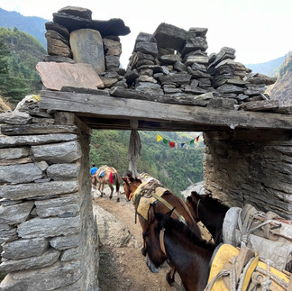 Wir sahen des Öfteren aufgeschichtete Steintafeln, die mit Schriftzeichen (Mantras) und Bildern versehen waren. Man nannte sie Mani, erklärte uns Urken und um Unglück zu vermeiden liefen wir immer links an ihnen vorbei. Den vielen vorbeiziehenden Eseln, die die schwere Ausrüstung der Expeditionen schleppten, flüsterte ich stets nette, aufmunternde Worte zu. Das sind richtig arme Schweine, diese Lastenesel.