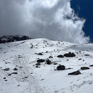Aber keiner - das musste man sich mal vorstellen! - der Guides hatte ein Satellitentelefon dabei. Das durfte nicht wahr sein. Urken beharrte nach wie vor darauf, dass es besser sei fortzufahren, schnell den Pass zu überqueren und hinten abzusteigen, um Höhe zu verlieren statt umzudrehen. Ich, wir mussten ihm glauben, denn er ist diese Strecke schon sieben Mal gelaufen. Als Eric kaum noch gerade gehen konnte, der Schnee erschwerte die Schritte auch noch zusätzlich, schnappte sich Urken auch noch seinen Rucksack. Wir hingen hier beide wie Falschgeld rum und uns war das richtig unangenehm, aber Leute, ganz ehrlich. Wenn es einem so schlecht geht und man gar nicht mehr weiß wo oben und unten ist und dann noch in einer so rauen Landschaft, dann nimmt man widerstandslos alle Hilfe an, die man kriegen kann. Es war sicher schon ein Fehler gewesen überhaupt loszulaufen, weil wir ja bereits Kopf-/Magenschmerzen gehabt hatten.