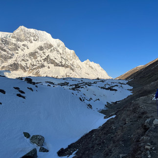 In Kathmandu im Hostel hatte Eric von einem Australier, der nun wieder zurückflog, je zwei Gamaschen (Schneeschutz für die Waden) und Grödel bekommen, so eine Art Steigeisen für eisige Partien. Quasi Schneeketten für die Wanderschuhe. Und unser Guide hatte uns versichert, die bräuchten wir nicht, die könnten wir im Hostel lassen und uns das Gewicht sparen. Und nun standen wir hier. Scheinbar die einzige Gruppe Volltrottel, die keine dabei hatte und schlitterten den Hang hinab. Um uns herum war Nebel, das Wetter trauerte mit uns. Gott sei Dank ist Eric erfahrener und nicht zum ersten Mal auf einem schneebedeckten Berg. Er stapfte mit letzter Kraft rechts von mir durch den tiefen Schnee. Wo er die noch hernahm, war mir ein Rätsel und es tat mir so Leid, dass es nochmal so anstrengend war. Ich schlitterte auf dem schmalen Weg entlang, setzte vorsichtig ein Schritt vor den anderen und ließ den Abhang links von mir nicht aus den Augen. Einmal rutschte mein linker Fuß weg, aber ich konnte mich noch halten. Dann wurde der Schnee so tief, dass ich immer mal mit einem Bein tief einsank. Eric war anders abgestiegen und schon unten, Urken sah nicht so aus als wisse er wo lang. Wir hatten nun alle nasse, eiskalte Füße. Es kostete Kraft sich jedes Mal wieder aus einem Schneeloch hochzuziehen und dann sank ich mit meinem linken Bein hüfttief ein. Urken zog an mir und ich sank noch tiefer, mein Fuß steckte fest. Ich schrie nach Eric, denn in unseren Guide hatte ich das Vertrauen verloren. Eric kam sofort auf mich zu, ich zog und keuchte, ich atmete panisch bis ich frei war und stapfte in seine Arme. Ich war völlig fertig und wir fragten uns warum wir sinnloserweise einer solchen Gefahr ausgesetzt wurden. Ich musste mich kurz setzen. Die Amerikaner und ihre Guides kämpften mit uns, aber sie hatten Grödel und staunten, wie wir es ohne schafften - uns blieb ja keine andere Wahl.