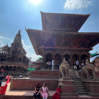 Allein würden wir nie den richtigen Bus finden, also mussten wir ein Taxi rufen, aber nutzten dafür die günstigere App inDrive und ließen uns zum Patan-Tempel im Süden der Stadt fahren. Wer mehr will, könnte auch ins Dorf Bhaktapur fahren. Wir quatschten mit einem Guide und der gab uns den Tipp von hinten die Anlage zu besuchen, dann mussten wir keinen Eintritt zahlen - für das unser Bargeld eh nicht gereicht hätte :D Wir liefen also durch die Gassen und Eric bestaunte mal wieder die Stromleitungen :D