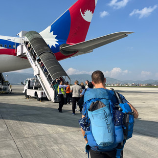 Irgendwann war wirklich alles reingestopft und nun war es schon kurz vor elf, weshalb wir ein Avocado-Sandwich aßen und uns Obst teilten. Kurz nach 12 Uhr holte uns der Chef von 14summits (ein echt cooler Typ) persönlich ab, wir bekamen noch eine leuchtend hellorangefarbene Gebetsfahne um den Hals und er trug meine 17.5kg schwere Tasche zum Auto. Eric trug sein 16kg Rucksack selbst :) Wir wurden zum Flughafen gefahren und wunderten uns über die auffällig hohe Präsenz von Militär und Polizei. Unser Fahrer klärte uns auf. Heute fliegt der Premierminister nach Indien und der Weg zum Flughafen wurde abgesichert. Na da. Wir mussten erstmal warten bis unser Check-In freigegeben wurde und uns dann zwischen drängelnde Asiaten quetschen. Es klappt bis hierhin, aber als wir dann auf Stühlen in diesem kleinen Flughafen Platz nahmen, mussten wir bald feststellen, dass unser Flug nochmal Verspätung hatte. Man hatte ihn vor zwei Tagen ja schon verschoben, was in unserer Planung so einiges durcheinander gebracht hatte und nun saßen wir uns hier stundenlang die Hintern platt. Wir gaben unsere allerletzten nepalesischen Rupien für Nüsse und ein Bounty aus; Wasser konnte man auffüllen lassen. Immer wieder gingen wir vor und schauten, ob unser Flug nun mit Gate dran stand, aber es stand ewig nur "verspätet" dran. Schlussendlich hoben wir mit fast 2h Verspätung ab und wir waren froh, dass wir eine Unterkunft gebucht hatten. Den Bus hätten wir so nun um Längen verpasst - es gab keine Entschuldigung, keine erklärenden Worte...nichts. Immerhin saßen wir in einer Zweierreihe und ich am Fenster.