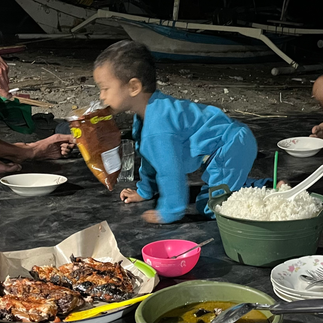 Jetzt mussten wir uns beeilen, weil wir hier immer so versackten, hatten wir gerade noch Zeit zu duschen und fuhren dann zum Fischer. Erst standen wir hilflos herum, sahen den Fisch schon auf der Feuerstelle, Schüsseln mit Reis und Fischsuppe. Wir waren froh zwei große Cola-Flaschen (hier Luxus) und Toast (sehr beliebt bei Cencens Enkel) mitgebracht zu haben und stellten es auf die Plane hinzu. Mit der für Franzosen meiner Meinung nach üblichen Unpünktlichkeit kam erst Thibault, gefolgt von seinen Eltern und dann einem reisenden Kumpel. Zusammen mit Cencens Familie setzten wir uns im Kreis auf die Plane und genossen den frischen Fisch.