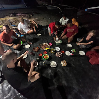 Als wir ausstiegen, sammelten wir ein wenig Plastikmüll am Strand, was uns verständnisvolle Blicke seitens Cencens Familie einbrachte, die hier seit unserer Abfahrt saßen. Einfach nur saßen. Das traurige dabei: Cencen hatte selbst erzählt, dass er ab und an statt Fische Plastik an der Angel hätte und als Fischer sollte ihm die Zukunft seiner Fanggründe eigentlich kümmern. Aber hier war alles zugemüllt, überall ums Haus herum lagen Tüten, Flaschen, Verpackungen und es schien keinen zu interessieren. Plötzlich vertrieb Cencen die düsteren Gedanken und gab mir einen der Fische in die Hand. Ähm. Okay, was sollen wir jetzt damit? Wir fragten ob wir ihn abends denn nicht zusammen essen könnten, mit seiner Familie? Marie hatte erzählt, dass er das auch schon gemacht habe. Der Franzose stimmte gleich zu und wir verabredeten uns für 19 Uhr. Cencen versuchte noch etwas mehr Geld für Knoblauch und Co. rauszuhandeln, aber Thibault, sein französischer Freund, verdarb ihm das Geschäft, zwinkerte uns zu und meinte er bringe dann aus seiner Küche Gewürze mit. Wir fuhren winkend von dannen, chillten noch ein wenig im Garten, bekamen sogar noch ein spätes Frühstück, ich las mein Buch und 14 Uhr waren wir auch schon bei Karang Divers mit Dinho verabredet. Auf dem Weg dahin besorgten wir noch frische Melone, die Setri aufschnitt und auf Eis kühlte bis wir aus dem Wasser kamen.
