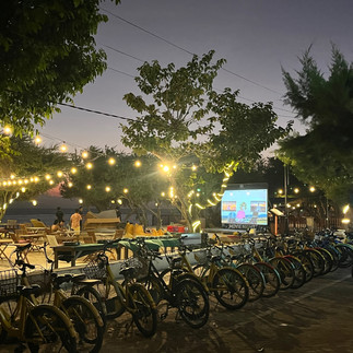 Wir planschten da so herum, ich zog noch ein paar Bahnen und dann siedelten wir für den Sonnenuntergang und eine Kleinigkeit zu essen auf die Sitzsäcke am Strand um. Leider wurde es dann aber Zeit weiterzufahren, denn wir hatten erst die halbe Runde geschafft und mussten die Räder auch noch abgeben. Auf unserer Weiterfahrt entdeckten wir Strandkinos, DJs und Feuershows und erinnerten uns wehmütig daran, dass wir ja heute noch nach Gili Meno zurückmussten. Schade Schokolade, aber nicht zu ändern.