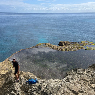 Noch hielt das Wetter, die Sonne ließ uns ganz schön schwitzen. Die Wellen waren heute eher sanft hier an den Klippen, nur eine sahen wir etwas höher spitzen, aber Eric entdeckte eine Schildkröte, die mehrmals auftauchte und Ben war ganz verzückt, denn es war die erste, die sie hier sahen. Sie waren ja erst angekommen. Dann sah Eric, der immer voran lief, nochmal Delfine vor der Küste - hach war das schön. Dann kamen wir an natürlichen Wasser-Terrassen vorbei und während die Chinesen um uns herum mit Schirmchen und in Spitze der Sonne posend trotzten, versuchten wir die Natur einzufangen und schossen ein gemeinsames Erinnerungsfoto.