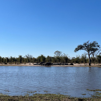 Der Campingplatz war der liebloseste Staubplatz, den wir je gesehen hatten. Und sie wollten 700 Pula (47€/ Nacht) in bar. Wir hatten 1.000 als Reserve abgehoben, denn ich erwähnte ja bereits, dass man ja angeblich fast überall mit Karte zahlen konnte. Dachten wir der Chobe Campingplatz mit 32€ (aber auch top ausgestattet und wahnsinnig liebevoll) war teuer gewesen, wurden wir nun eines Besseren belehrt. Die wilden Elefanten kamen, so konnten wir beobachten, ganz nah an die Zelte heran und die Vorstellung quasi schutzlos im Dachzelt neben ihnen zu schlafen, behagte uns nicht. Wir setzten grußlos unsere Safari fort, sahen auch noch Zebras und Krokodile. Jedes Mal gerät man echt ins Staunen, dass man quasi einfach so dicht vorbeifährt und sie bewundern kann - eine der wenigen schönen Seiten unseres Afrika-Abenteuers. Wir fuhren von der Haupt-Sandstraße mal in noch sandigere Nebenstraßen ab, ein wahres Labyrinth aus Wegen, die aber tatsächlich in unseren Navigationsapps alle eingezeichnet waren. Wir entdeckten einen kleinen Campingplatz, der wollte gleich mal 51€ in bar haben. Meine Güte, was war hier nur los. Wir überlegten ob es einfach an diesen kleinen, urigen „besonderen“ Plätzen lag und fuhren zu einem großen, anonymen, schmucklosen Platz weiter. Dort hatte das Office aber bereits 17 Uhr geschlossen und man ließ uns gar nicht erst durchs Gate fahren. Verwunderlich, alles sehr verwunderlich. Bald würde die Sonne untergehen. Bei einem Platz wollten wir noch fragen, sonst fuhren wir eben wieder raus aus diesem offenbar überteuertem Gebiet. Auf dem Weg hielten wir am Hippo-Pool. Die Zeit eilte zwar, aber der Anblick war zu schön. Lauter Nilpferde chillten hier in der Abendsonne, schauten uns knapp über der Wasseroberfläche an, wackelten mit den Öhrchen, platschten ab und zu, denn und wenn ließ mal einer ein herzzerreißendes Gähnen sehen oder wir hörten ein Protestgrummeln. Hier sollte es einen Hippo-Campingplatz geben. Na gut, auf einen letzten Versuch. Wir hofften, dass er preiswerter sei.