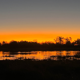 Wir brieten ein wenig Knoblauchbrot überm Feuer und weil während der Fahrt zwei Wasserkanister geplatzt sind, hingen wir ein paar Hüllen zum Trocknen über die Stühle. Neben uns ging glühend die Sonne unter und das war definitiv einer meiner geliebten Afrika-Momente! Der abendliche Feuerball spiegelte sich im Hippo-Pool und hob so die Tiersilhouetten hervor. Es sah wirklich magisch aus! Wie flüssiges Gold.