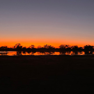 Während wir fuhren ging die Sonne auf und eine Baumreihe spiegelte sich im gold aufleuchtenden Weiher.