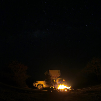 Die Fahrt hatte sich also gelohnt und wir standen mitten auf einem ausgetrockneten Salzsee, schauten der untergehenden Sonne zu und das Schöne war: wir waren nicht allein. Einige andere campten auch hier, was es doch etwas gemütlicher so ab vom Schuss machte. Nach dem Spektakel fuhren wir erstmal schauen wo eine geeignete Stelle zum Campen sei, aber überall pfiff der Wind sehr stark. Wir stellten uns letztendlich an eine Feuerstelle. Ich schnippelte fleißig Kartoffeln, Möhren, Zucchini, Knobi und Zwiebeln, währenddessen entzündete Eric ein Lagerfeuer. Dann schrieb ich am Feuer und Eric würzte das Abendbrot und ließ es köcheln. Arbeitsteilung im Wechsel :D Es sollte einer der schönsten Abende in Afrika werden. Der Sternenhimmel über uns war sternenklar ;), die Milchstraße leuchtete auf uns herab. Nur selten drang ein Laut von anderen Campern (meist ein Lachen) zu uns. Das Feuer knisterte, es war wohl auch so die wärmste Nacht, die wir hier erlebten. Das Cider schmeckte, das Essen sowieso und wir genossen es einfach hier zu sitzen, unter den Sternen. Und das allerbeste, was wohl auch das Wohlfühlen-Feeling komplettierte: wir zahlten hier keinen Cent, sondern standen das erste und vielleicht einzige Mal kostenlos mit unserem Dachzelt hier herum.