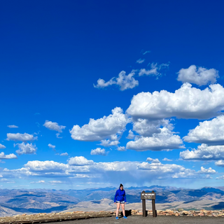 Oben angekommen, quatschten wir ein bisschen mit einem Paar aus San Diego und machten gegenseitig stolze Fotos. Die Aussicht war der Hammer! Dafür lohnt sich jeder Muskelkater in den Waden (der dank Magnesium und Arnika-Salbe hoffentlich ausbleiben wird). Am Anfang waren wir auf Grund der Wolken über uns skeptisch, da wir winzige Tropfen spürten. Aber die sind vorbeigezogen und zurückblieben malerische (hui, verwende ich das Wort oft) Wattewölkchen. Das sieht viel schöner aus (und schützt ein bisschen vor der Sonne) als ein klarer blauer Himmel. Perfekt. Wir konnten uns gar nicht satt sehen und haben viel zu viele Fotos geknipst. Einen Bär sahen wir auch auf dem Rückweg nicht.