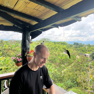Jedenfalls übernahm ab hier jetzt Mario. Er war genauso sympathisch, sah wesentlich älter aus als 67, hatte sehr lange in den USA gelebt, weil seine Eltern mit ihm ausgewandert waren, wurde aber nach übermäßigem Alkoholkonsum am Steuer ausgewiesen. Seine Kinder leben mit ihren Familien noch dort und er möchte bald zurück. Er hatte auch im Vietnamkrieg für die USA gekämpft, zeigte uns die langen Narben auf seinem Bauch und wir sollten hinter seinem rechten Ohr fühlen, wo eine Patrone steckte. Er hatte damals Glück gehabt, meinte er. Wahnsinn. Er freute sich für uns zu übersetzen, oft hatten wir aber schon auf das Spanische geantwortet. Wir sahen dann auch warum Luis verschwunden war. Es gab sie doch hierher, die Gruppentouren, denn ein Minibus spuckte die jungen Leute aus, die gestern auch die Wanderung übernommen hatten. Ach ganz ehrlich, uns gefiel die Privattour und wir wurden überaus lieb behandelt, mit Handschlag von allen verabschiedet und nachdem wir selbst eine Kakaokugel hergestellt hatten, tranken wir auf der Terrasse eine heiße Schoki. Diesmal gabs leckereren Käse mit Toast dazu. Als die Töchter bemerkten mit welcher Begeisterung wir die Vögel beobachteten, eilten sie mit Fernglas und Vogel-Poster herbei. Die Kolibris waren hier mal so gar nicht schüchtern und umflogen ständig Erics süßen Kopf. Außerdem fielen uns die Bischofstangare in blau weiß und die gelb blauen Schwarzflügel-Trupiale. Dagegen sieht unser Spatz etwas farblos aus :D