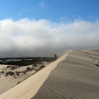 Unsere Energie war wieder aufgeladen und mit Sonne und Essen im Bauch machten wir wieder los. Ich sag’s euch. Das Glück war auf unserer Seite. Aus guter Laune heraus hielten wir am nächsten Schild. Auch hier musste man $5 bezahlen und eine Frau meinte zu uns, es lohne sich sehr! Nur waren die Auskünfte sehr verwirrend. Eine Selbstregistrierung gab es nicht wie ausgewiesen, online funktionierte ja bei uns nicht und Eric joggte zu dem angegebenen Campground in der Nähe um den Tagespass zu kaufen, aber den gab es dort gar nicht und die verwiesen wieder auf die nicht vorhandene Selbstregistrierung. Sinnlos. Eric traf auf dem Weg einen Obdachlosen im Wald, der grad seine Messer wetzte, aber auch nicht helfen konnte. Ein Paar meinte, sie finden es auch richtig dumm, dass alles nur noch online funktioniere, aber ja gar nicht für alle möglich sei und wir sollen einfach einen Zettel in die Windschutzscheibe legen. Das tat ich dann auch und empfahl einem ebenso ratlosen Rentnerpärchen das gleiche. Und dann stiefelten wir los. Wir bogen um eine Ecke und sahen ein bisschen Sand. Darüber waren wir schon sehr froh. Was wir aber dann eine Ecke später sahen, machte uns sprachlos. Endlich sahen wir sie! Die Dünen von Orgeln erstreckten sich vor uns und leuchteten im Sonnenschein. Das innere Kind kam raus und wir sprangen und rutschten die Sandhügel hinab, zogen neue Spuren in den Sand. Das war ähnlich befriedigend wie die erste Spur in den Neuschnee zu ziehen. Wir liefen gut anderthalb Stunden auf und ab und waren sehr froh, dieses Highlight zu erleben und das auch noch im Sonnenschein! Und nun lasse ich euch erstmal eintauchen in die Dünenwelt, die uns Lust auf die französischen Dune de Pilat am Atlantik machten, von denen auch meine Eltern so geschwärmt hatten.