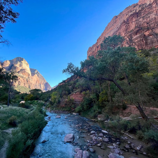 Damit wir schonmal eintauchen und auf andere Gedanken kommen, nahmen wir das kostenlose Shuttle und fuhren zur Haltestelle Zion Lodge. Von da aus liefen wir einen Rundweg zu den drei Emerald Pools. Wir begannen am Lower, liefen dann zum Middle und zum Schluss zum Upper Pool, also von unten nach oben. Die Natur und die rötlichen Farben vor dem blauen Himmel faszinierten uns.
