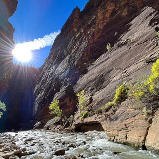 Wir füllten unser Wasser auf; hier gibt es überall Stationen und ein Shuttle brachte uns zum Nationalpark. Dort musste man zu Fuß vorbei um den Nationalparkpass zu zeigen und wir stiegen am Visitor Centre ins neue Shuttle. Wir stiegen kurz aus um einen Mini Weg zu gehen und blickten auf die drei Patriarchen, dann nahmen wir den nächsten Bus (sie fahren aller 6min) und fuhren zur Endhaltstelle, dem Tempel of Sinawava. Ich dachte Eric kippt mir vom Sitz als wir an Kletterern vorbeifuhren, die sich gerade eine Route am roten Fels nach oben suchten…wir liefen den Riverside Walk am Fluss entlang und dann noch ein Stück von the Narrows.